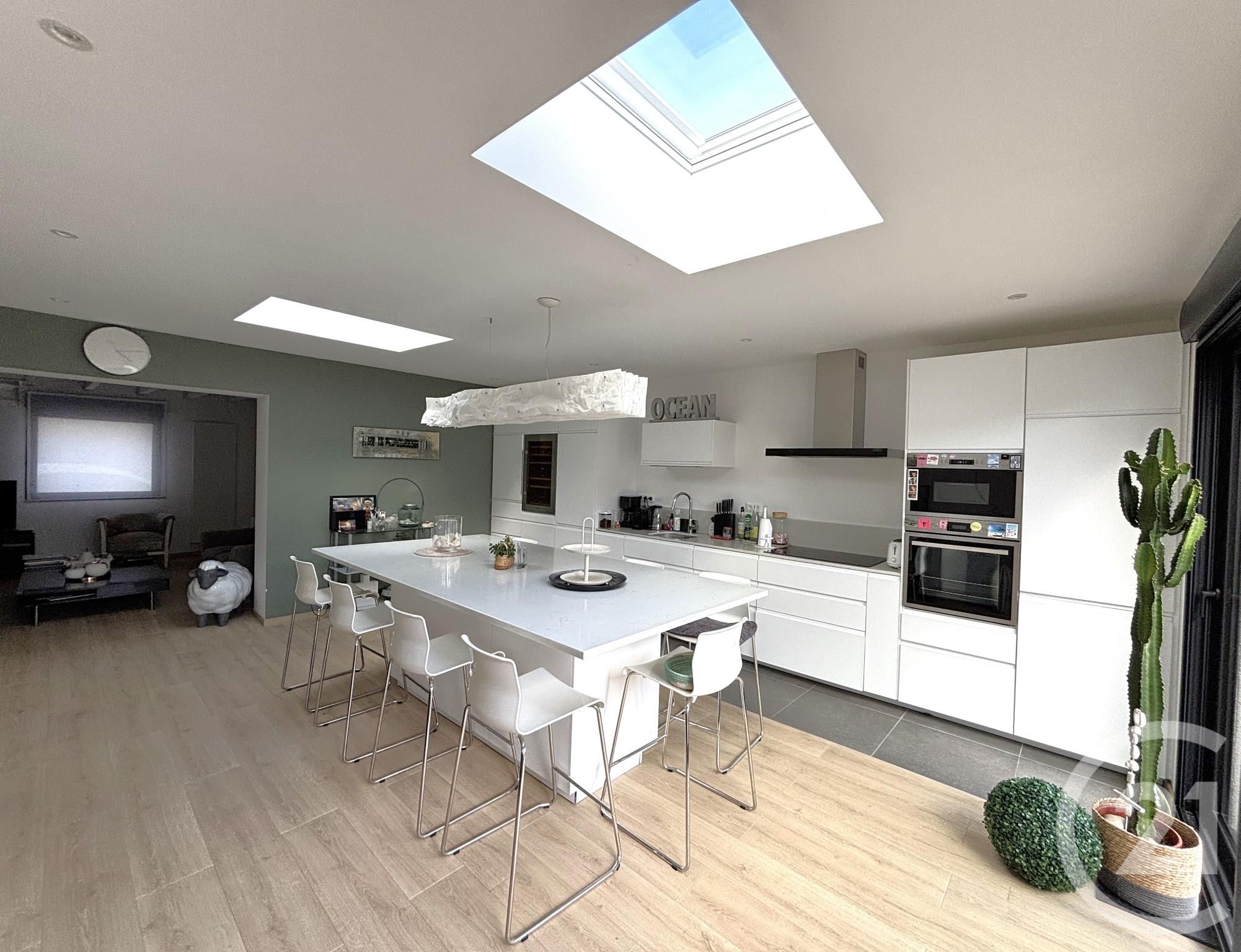La cuisine entièrement aménagée et équipée s'ouvre sur une belle terrasse et un jardin verdoyant, idéal pour profiter de moments conviviaux en extérieur.